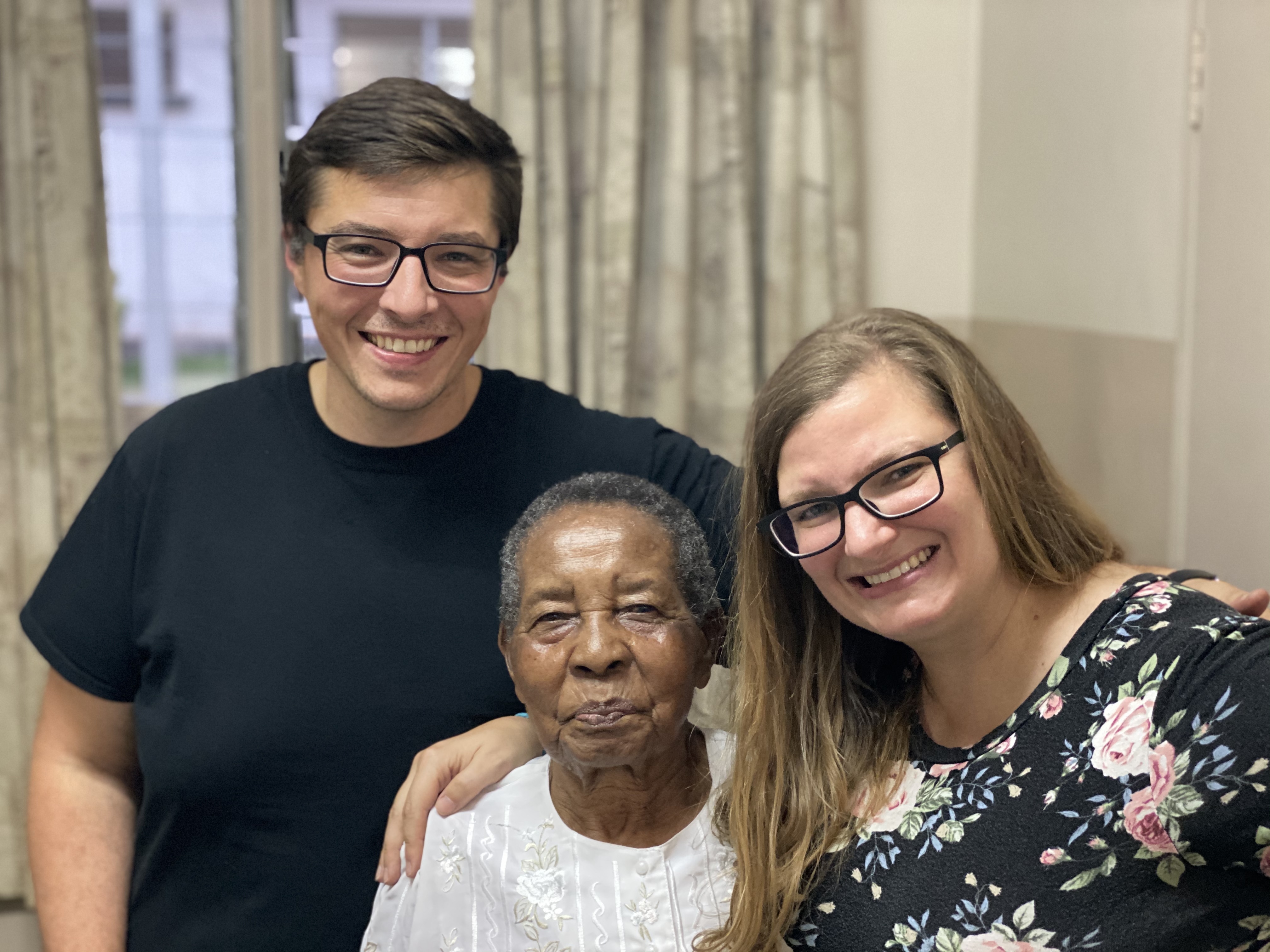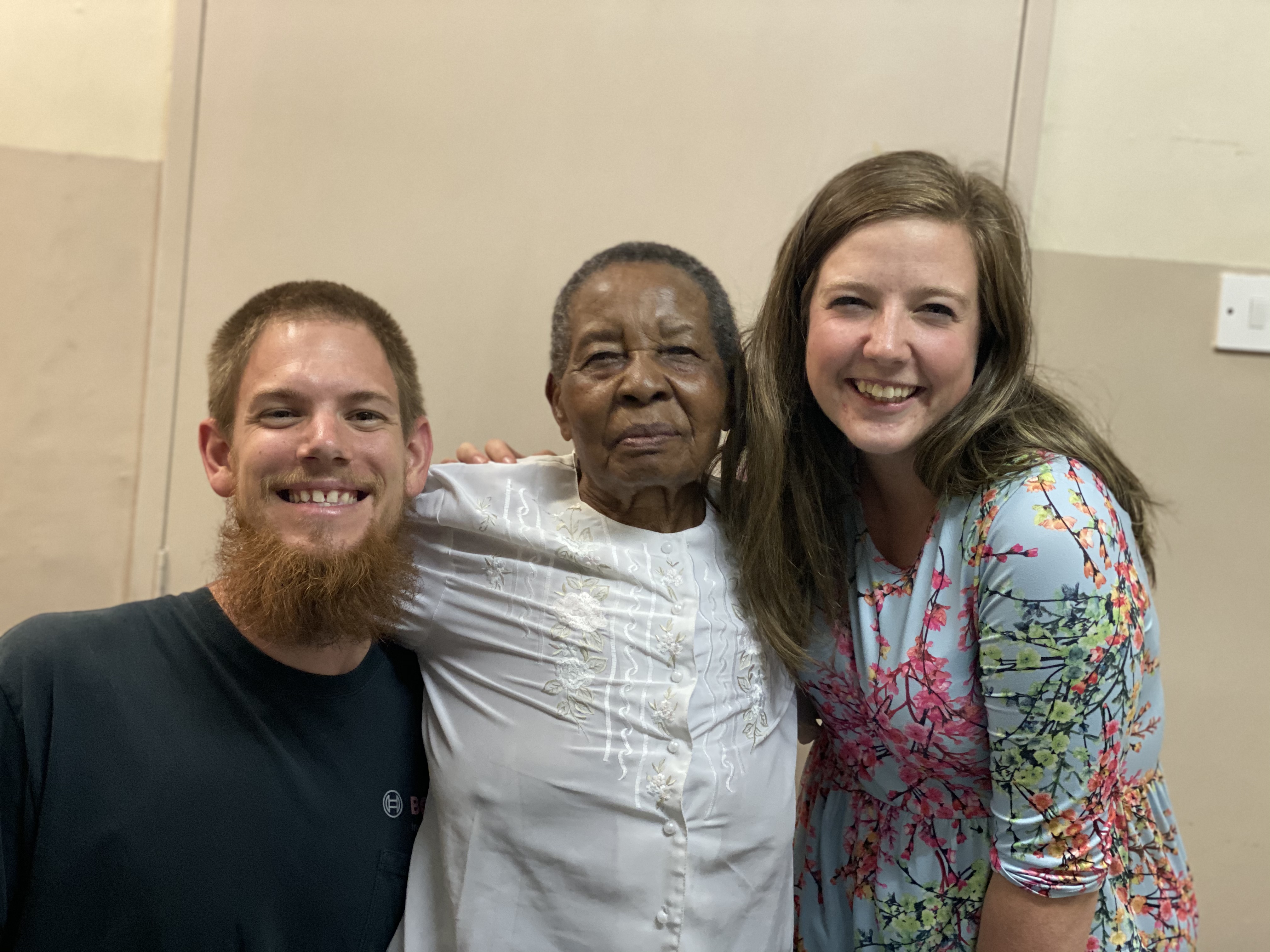 Nick kneeling with Mrs. Chilopora