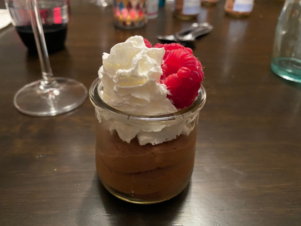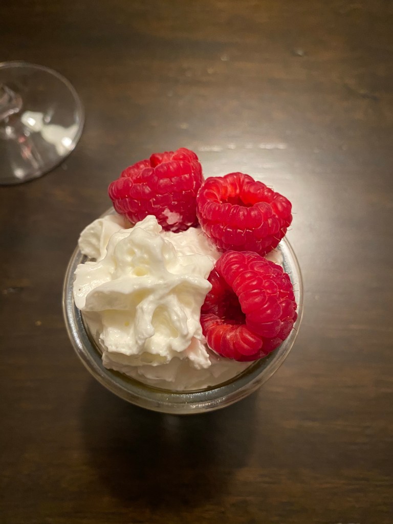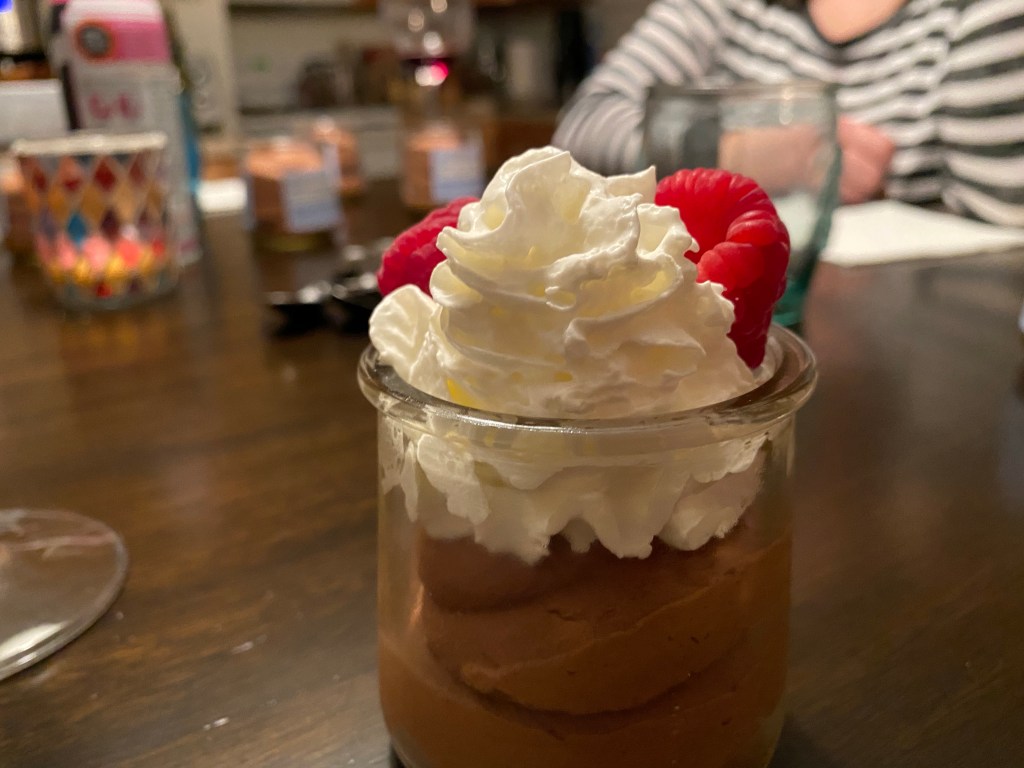 Bittersweet chocolate melted with butter, combined with unsweetened whipped cream for a creamy, rich dessert. Topped with lightly sweetened whipped cream and fresh raspberries.