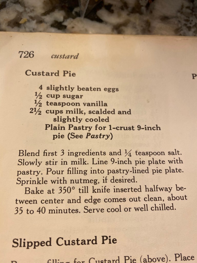 Growing up my mom had this old, well-used (read: total wreck) “Better Homes and Garden” cooking encyclopedia set, and I loved it. When I was older, I told mom that when she died, I called dibs on the set. Thankfully, my parents are still very much alive, but when they moved from Ohio to Texas they had to downsize just a bit, and she offered me her cookbook set. I was thrilled… but also, why did I want these cookbooks?! I don’t typically use cookbooks or even recipes for that matter. Unless of course I’m making something new, or baking… baking is science, man, you have to be precise. Anyway, I remembered why I wanted these cookbooks, they’ve got some great recipes. I mean, let’s be honest, these are from the late 60’s, early 70’s, there are some terrible recipes in there (not everything needs to be set in Jell-O, BHG!), but there are some real gems, and they give tips on why something might not be working out. This week I started jonesing for some custard pie… I love a good, homemade custard pie. So here are the results. I follow this recipe perfectly, except, I don’t sift the flour for the pastry, and I use butter instead of shortening. I like it warm or chilled.