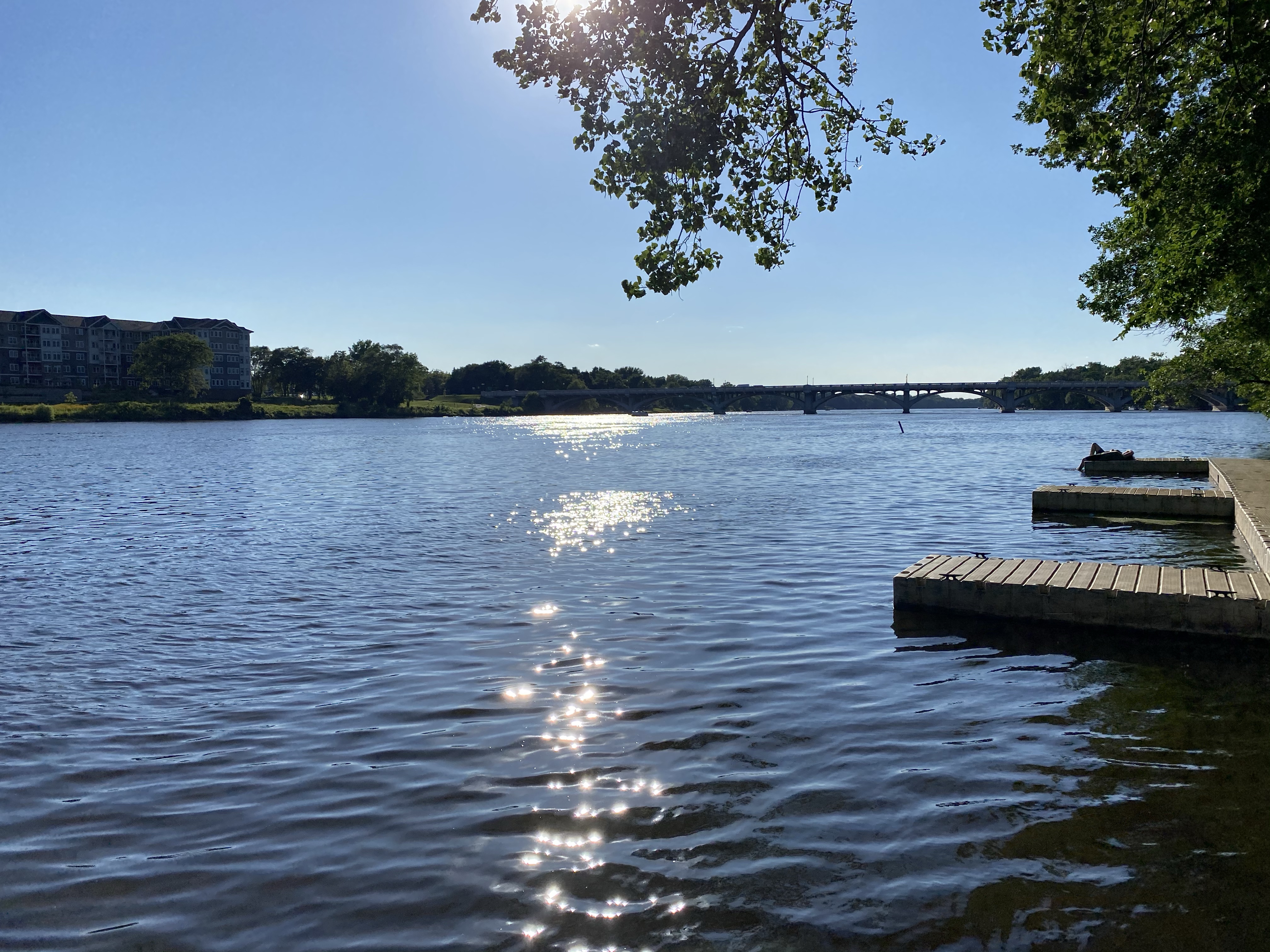 Later Dave took us to several parks for a little stretch of the legs after our drive. We visited the confluence of the Rum River and the mighty Mississippi River (it was Josh’s first time seeing the latter, the former also, but I guess the latter is more noteworthy), then on to Anoka Riverside Park, which has an interesting history. The park was part of the flood plain plan until 2001 (I think, I didn’t take a picture of the plaque, and now I’m only mostly confident in my memory), then the area was raised by around seven feet, removing it from the flood plain. There are beautiful condos lining the walk on one side, and beautiful trees and the river on the other.