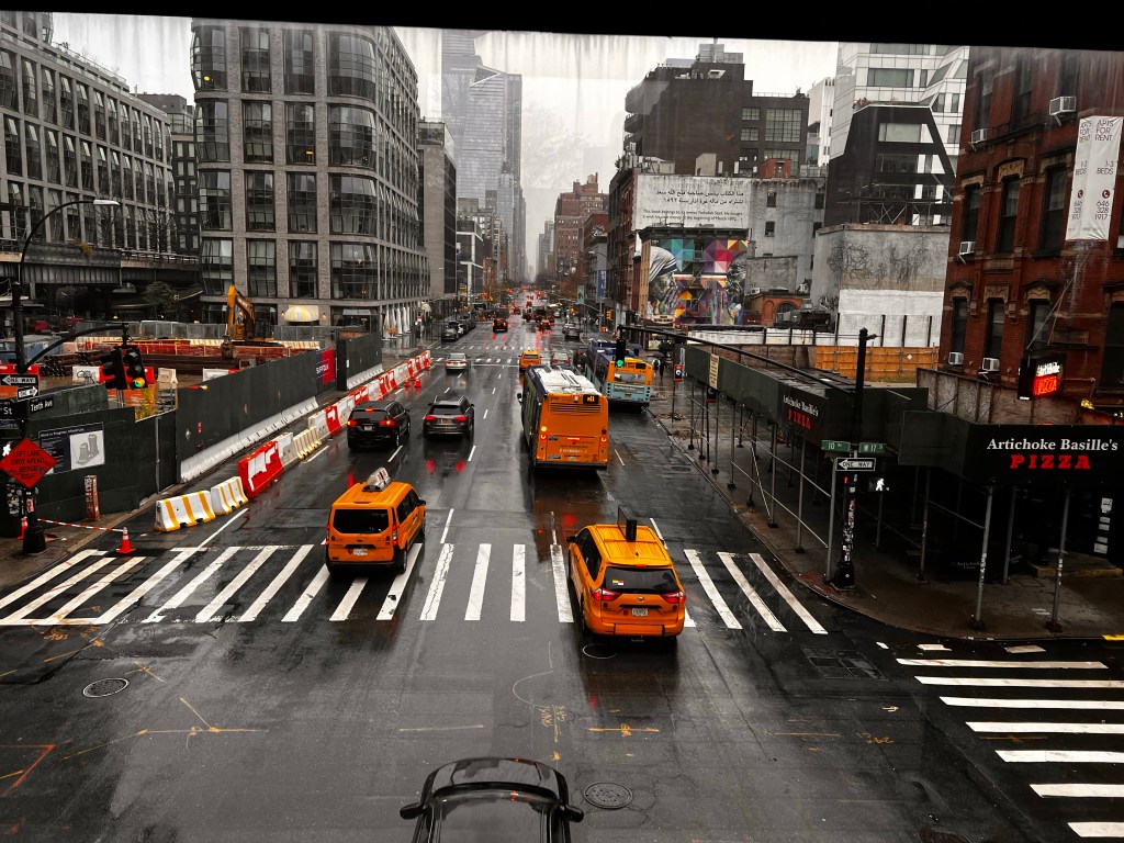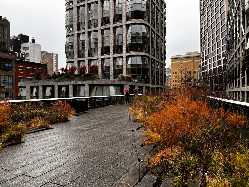 The day started out warmish, but cloudy. but partway down the path it started pouring down rain! So we cut the walk short and exited at the Chelsea Market to get warmed up and have some lunch.
