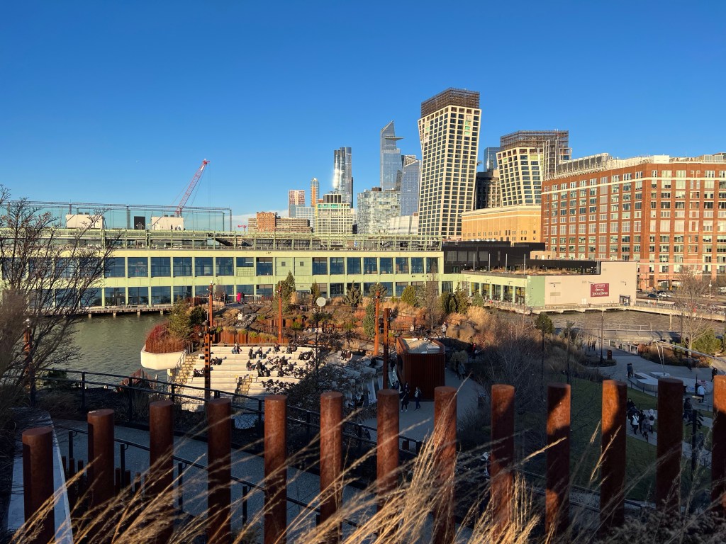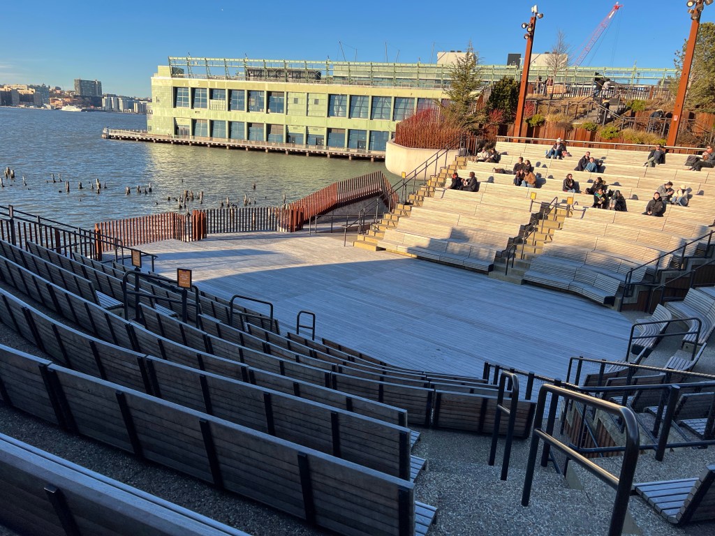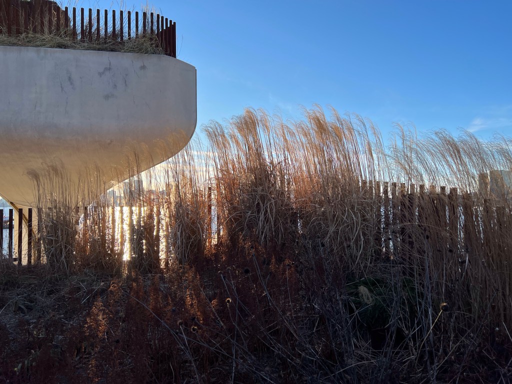 In 2012 Hurricane Sandy hit NYC, leaving heavy damage in her wake, including Pier 54. In 2013 the Hudson River Park Trust partnered with the Diller-von Furstenberg Family Foundation to begin development on a whole new kind of park. The park is literally built in the river; comprised of 132 “tulip pots” (giant columns with bowls at the top sunk into the river to form the base of the park). The park covers 2.4 acres filled with trees, shrubs, grasses, and bulbs. There’s an amphitheater, trails, tables and chairs, in the summer there are a couple of food trucks, and some benches scattered about.